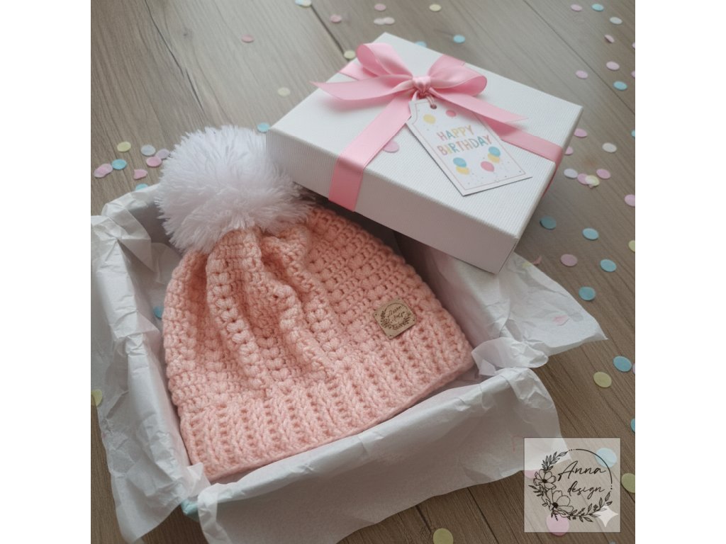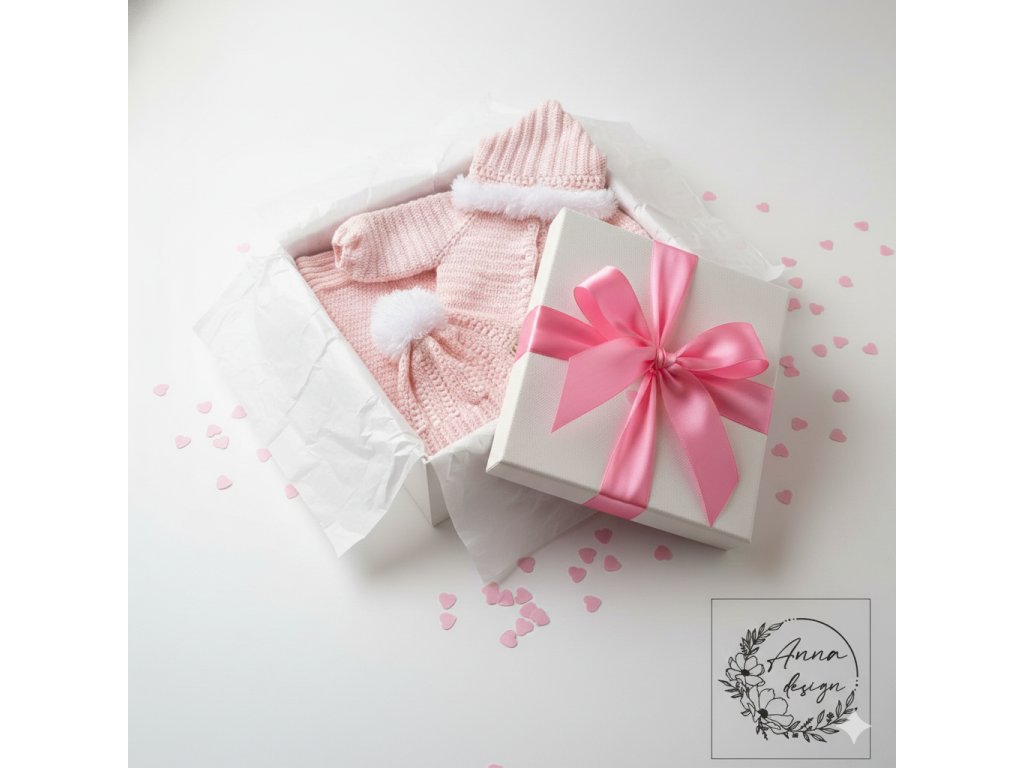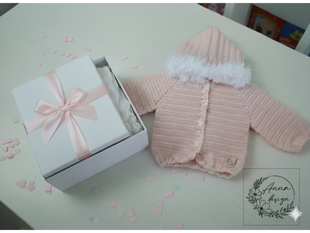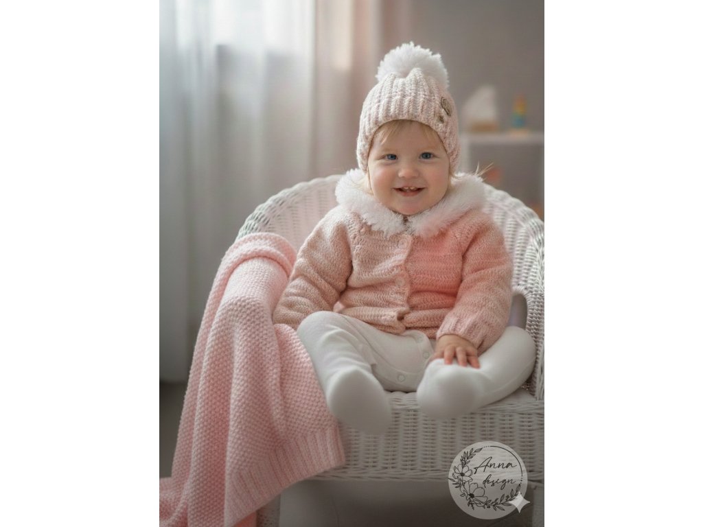Elegantný detský set v jemnom púdrovo-ružovom odtieni, pozostávajúci z háčkovaného svetríka a čiapky pre dievčatko (cca 6 mesiacov), doplnený o precízne pletenú deku.